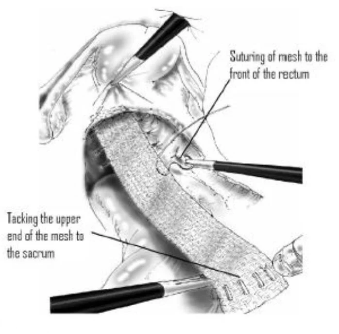 Tijdens de ingreep creëert de chirurg ruimte tussen de endeldarm en de vagina. Aansluitend wordt het netje vastgehecht aan de voorzijde van de endeldarm, de top van de vagina en het heiligbeen (sacrum).