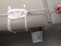 Voor het slapengaan verbindt u het uiteinde van de beenzak met een nachtzak (zie foto 1). De nachtzak is een zak waar twee liter urine in kan, zodat u ’s nachts niet moet opstaan om de zak leeg te maken. U kan best de verbinding tussen de sonde en de beenzak niet openen om een nachtzak aan te koppelen. Nadat u de nachtzak met de beenzak verbonden hebt, opent u het kraantje van de beenzak zodat de urine van de beenzak in de nachtzak kan doorlopen.