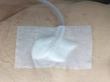 Drie keer per week dient de insteekplaats ter hoogte van de onderbuik gereinigd te worden met fysiologisch water/alcoholische ontsmettingsstof. Hiervoor wordt best een droog verband gefixeerd (foto 3). Best wordt de sonde telkens op een andere plaats gefixeerd, zodat er zich geen ‘wild vlees’ of drukletsel kan vormen ter hoogte van de insteekplaats. Dus als de sonde de ene week links op uw buik gekleefd wordt, wordt hij de andere week rechts vastgekleefd.
